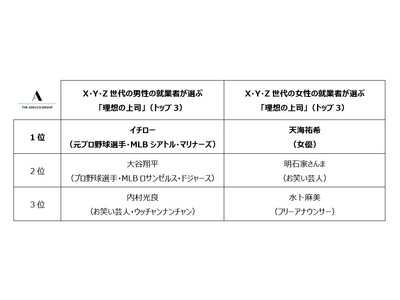 男性の就業者が選ぶ「理想の上司」は「イチロー」、女性の就業者が選ぶ「理想の上司」は「天海祐希」でした。イチローさんと天海祐希さんは、男女ともにすべての世代の就業者が「理想の上司」のトップに選びました。