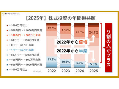 日経平均株価が史上初めて5万円の大台を突破した2025年。全体のおよそ9割となる89.3%が、株式投資から利益を得ていると回答しました。2022年以降、利益となっている人の割合は年々増加し、その金額も増えています。その一方で、株式投資に対するストレス度合いは、例年と大きく変わりませんでした。