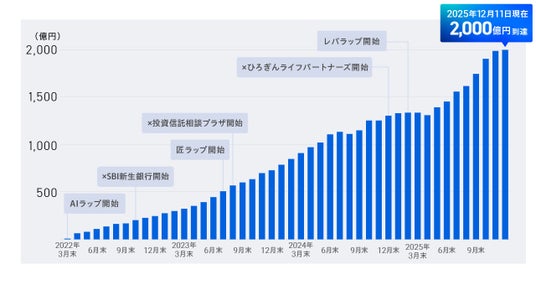 SBI 証券と FOLIO は、SaaS型投資一任プラットフォーム「4RAP(フォーラップ)」を通じて2022年3月から「SBIラップ」のサービス提供を開始しました。「SBIラップ」の運用資産残高は2025年12月11日に2,000億円を突破し、2025年7月に1,500億円を突破してからわずか5ヵ月弱での達成となり、多くの方にご利用いただいております。