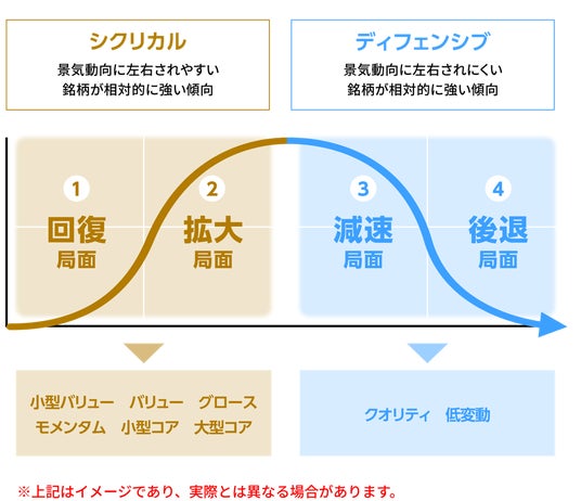 景気局面に応じて有効なファクターを選び、S&P500を上回るリターンを目指す戦略です。定量法で景気動向を分析し、小型バリュー、バリュー、グロース、モメンタム、小型コア、大型コア、クオリティ、低変動の8種類のファクターから選定を行います。データ分析に加えて、経験豊かな運用チームが定性的な検討を行い、投資判断を行います。