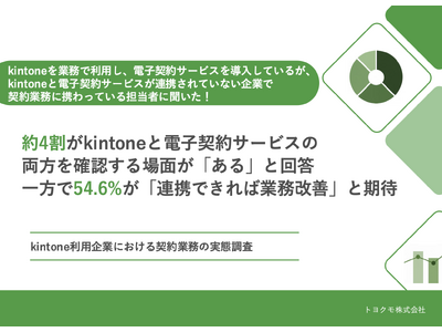 誰でも簡単に使えるビジネス向けのクラウドサービスを提供するトヨクモ株式会社(本社:東京都品川区、代表取締役社長:山本 裕次、以下トヨクモ)は、kintoneと電子契約サービスを未連携で併用する企業の担当者106名を対象に、「kintone利用企業における契約業務の実態調査」を実施しました。