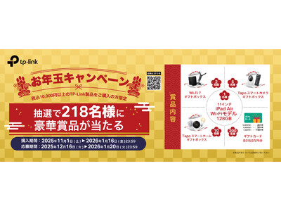 TP-Linkグループ(本社:米国カリフォルニア州アーバイン)の日本法人、ティーピーリンクジャパン株式会社(本社:東京都千代田区外神田、以下ティーピーリンクジャパン)は、12月16日(火)より「お年玉キャンペーン」を開催いたします。