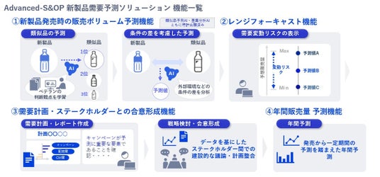 NECは、独自のAIを活用しステークホルダーの合意形成を予測で支援するAdvanced-S&OP 新製品需要予測ソリューションを販売しています。これまでの新製品開発においては、過去のデータが十分にないために、一般的なアプローチで「予測を当てに行く」ことは困難でしたが、AIを用いた予測値の提供、支援により誰でも同じ成果を出せるようにしました。