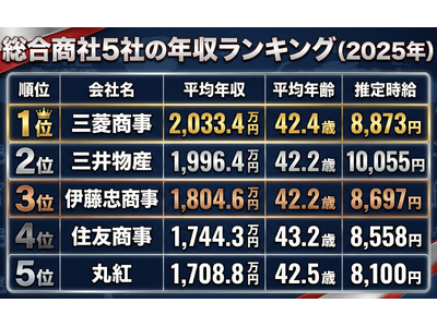 Career Reveal(キャリア・リビール)は、企業が開示する人的資本データを可視化するデータプラットフォームです。このたび、上場企業が公開する有価証券報告書などの一次情報をもとに、総合商社業界(大手5社)の年収データを分析し、2025年期の「年収ランキング」を公開しました。