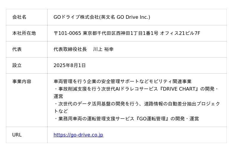 GOドライブ株式会社は、「運転」をより安全に、より便利に進化させることを目指し、車両管理を行う企業の安全管理サポートなどモビリティ関連事業を展開しています。テクノロジーの進化と使う人々の力を融合させ、より多くの交通課題を解決し、すべての人々が安心して暮らすことのできる社会の実現を目指します。