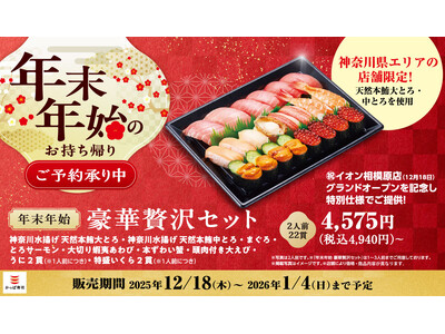 コロワイドグループのかっぱ寿司(カッパ・クリエイト(株) 本社:神奈川県横浜市、代表取締役社長:山角豪)は、2025年12月18日(木)に「かっぱ寿司 イオン相模原店」をグランドオープンいたします。オープンを記念し、神奈川水揚げの天然本鮪を使用した『年末年始 豪華贅沢セット』を、神奈川県内の全15店舗限定で販売いたします。