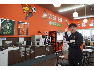 壁面はクラブカラーのオレンジ色に塗装され、エンブレムやロゴを用いた装飾、ヴィアティン三重と一号舘のマスコットキャラクターがデザインされるなど、コラボレーションが行われました。その他、ヴィアティン三重の応援自販機も設置されており、地域の方が集まるスペースでクラブの後押しをしていただいております。
