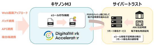 このたび、キヤノンMJとサイバートラストは、企業間でやり取りされる電子文書の安全性と信頼性の強化に向け、トラスト※3分野での協業を開始します。キヤノンMJが提供するデジタルドキュメントサービス「DigitalWork Accelerator」とサイバートラストの「iTrust リモート署名サービス」および「iTrust eシール用証明書」を連携し、「DigitalWork Accelerator」で管理するPDF形式の電子文書にeシールを自動付与する機能を2026年1月下旬より提供開始します。