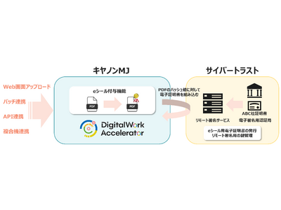 キヤノンマーケティングジャパン株式会社(代表取締役社長:足立正親、以下キヤノンMJ)とサイバートラスト株式会社(代表取締役社長:北村裕司、以下サイバートラスト)は、企業間でやり取りされる電子文書の安全性と信頼性を強化するため、電子文書の真正性や非改ざん性を確保するトラスト分野での協業を開始します。キヤノンMJが提供するデジタルドキュメントサービス「DigitalWork Accelerator 電子取引管理サービス」で管理するPDF形式の電子文書に、サイバートラストの「iTrust リモート署名サービス」 を活用したeシール※1自動付与機能を2026年1月下旬より提供開始します。