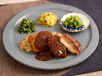 特製みそカツ」は、甘く香ばしい赤みそだれをベースに、かつお出汁で上品な旨みを重ねた特製みそだれが決めての一品です。ロースカツにじゅわっと染み込み、しっとりとした食感と香ばしさが口いっぱいに広がります。添え野菜はキャベツとにんじんを合わせ、やさしい旨みを全体にまとわせました。みそだれをたっぷりかけて、カツ、野菜を一緒にお召し上がりいただくのがおすすめです。