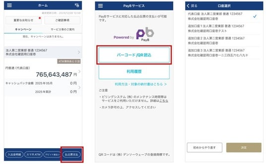 PayBサービスは、公共料金や通信販売などの各種支払いに使用される払込票のバーコードや二次元コードを、スマートフォンのカメラ機能で読み取り、当社預金口座を支払い口座に設定いただくことで、コンビニ等に出向く手間なく、場所・時間を問わず、リアルタイムに支払いが行えるサービスです。