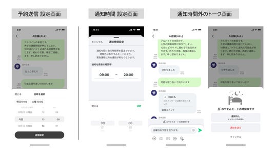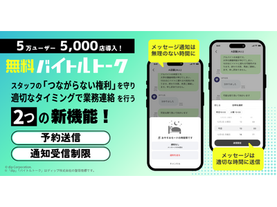 本サービスは「予約送信」「通知受信制限」機能の提供を来春(※)より開始いたします。これらの新機能により、店舗管理者とアルバイト従業員双方が、必要な連絡を適切なタイミングでやり取りできる環境を整備します。