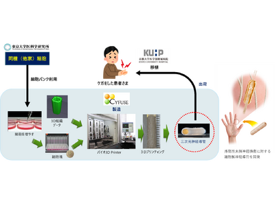京都大学医学部附属病院整形外科は、手指の外傷性末梢神経損傷に対して、臍帯由来間葉系細胞を原材料として臨床用バイオ3Dプリンタを用いて製造した三次元神経導管移植の医師主導治験を実施します。これまでに同種の細胞から調製した三次元組織を、免疫抑制剤を使用せず移植する治療は報告されていません。本治験が成功した際には、世界初の同種の細胞から調製した三次元組織を移植する再生治療となり、再生医療の開発が加速することが期待されます。