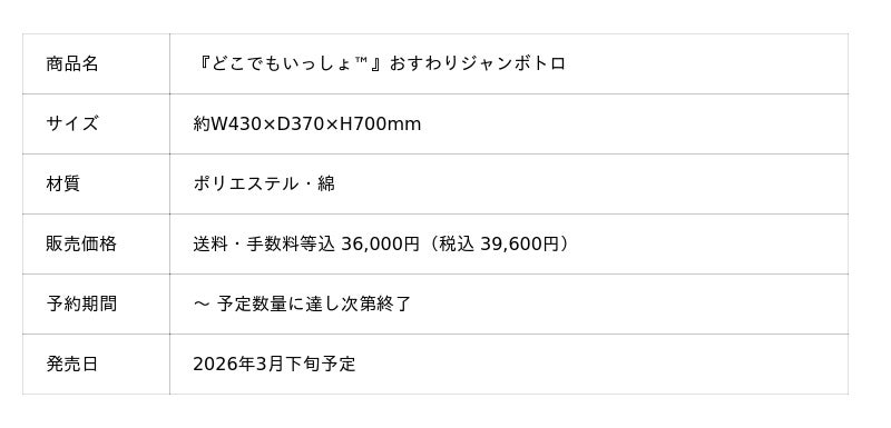 『どこでもいっしょ(TM)』おすわりジャンボトロは、更なるクオリティアップのため発売日を2026年2月下旬から2026年3月下旬へと延期致します。