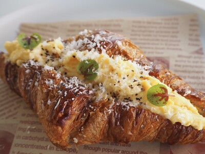 香ばしいクロワッサンに、ふわふわのオムレツをサンド。仕上げにふわっととろけるチーズをたっぷり削りました。