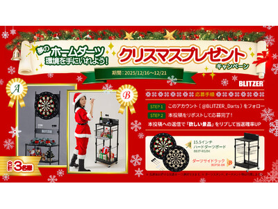 弊社ダーツボード・ゲームブランド「BLITZER(R)(ブリッツァー)」は、本日2025年12月16日(火曜)~同月21日(日曜)の6日間、豪華ダーツ用品が当たるプレゼントキャンペーンを実施することをお知らせいたします。