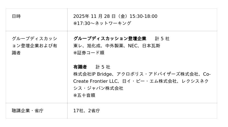 - 他業界の知財に関する取り組みを聞ける良い機会となった。特に、知財リッチとは考えにくい業種においても、知財がビジネスモデルや資本政策と結びつき、企業価値向上につながっているというストーリーに感心した。