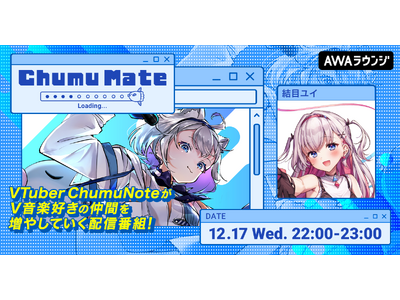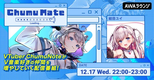 AWA株式会社(本社:東京都港区、代表取締役CEO:冨樫晃己)が運営する、サブスクリプション型(定額制)音楽ストリーミングサービス「AWA(アワ)」は、2025年12月17日22:00~23:00の1時間に渡り、無料で誰でも参加できるオンライン空間「ラウンジ」で、VTuberのChumuNoteがゲストアーティストと共に楽曲を深掘りし、V音楽好きの仲間を増やしていく音楽番組『ChumuMate』の第16回を開催いたします。