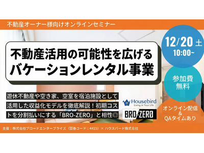 株式会社ブロードエンタープライズ(本社:大阪府大阪市、代表取締役社長:中西 良祐、証券コード:4415、以下、当社)は、ハウスバード株式会社と共催で、2025年12月20日(土)に不動産オーナー様向けオンラインセミナーを開催いたします。