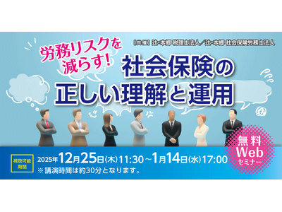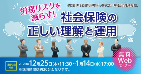 辻・本郷 税理士法人(本社:東京都新宿区、理事長:桑木小恵子)は、辻・本郷 社会保険労務士法人(本社:東京都新宿区、代表社員:高橋紀行)と共催で、2025年12月25日(木)より「労務リスクを減らす! 社会保険の正しい理解と運用」セミナーを開催いたします。何となくわかっているつもりの社会保険。企業経営では労務リスクを回避するためにも、正しく理解しておく必要があります。本セミナーでは、実際に発生したトラブル事例を踏まえ、社会保険の基礎知識と適用範囲を解説します。令和7年に成立した「年金制度改正法」の主要改正点にも触れ、企業経営に欠かせない実務対応のポイントをお伝えします。