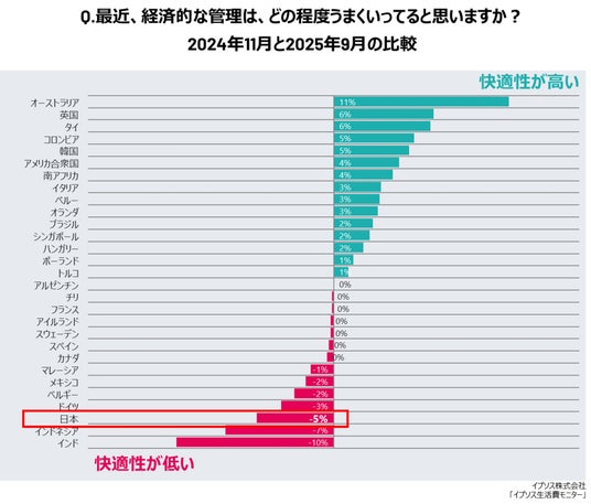 「最近、経済的な管理(やりくり)は、どの程度うまくいっていると思いますか?」という問いに対し、「快適に暮らしている」「まぁまぁうまくやっている」とポジティブな回答をした日本人は全体の20%にとどまりました。これは、30カ国平均37%を大きく下回り、17ポイント差という際立って低い水準であることが明らかになりました。また、2024年11月と比較すると、その快適性は5ポイント減少していることもわかりました。