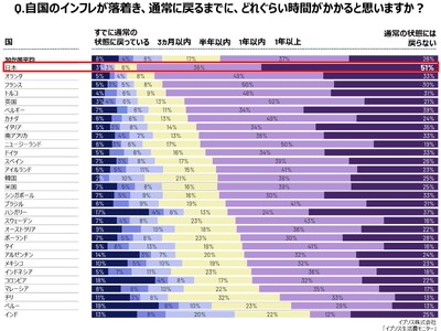 「自国のインフレが落着き、通常に戻るまでにどのぐらい時間がかかると思いますか?」という質問に対して、日本人の半数以上、51%の人が「通常の状態には戻らない」と考えていることがわかりました。これは、調査対象30カ国の中でも断トツの多さで、次点のオランダに18ポイントもの差をつけ、かつ30カ国平均26%の約2倍にのぼりました。