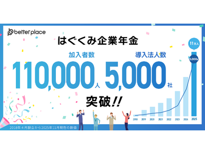 https://bpcom.jp/、以下、ベター・プレイス)は、2025年11月末時点で「はぐくみ企業年金」の加入者数が11万人を超え、さらに導入法人数が5,000社を突破したことをお知らせいたします。