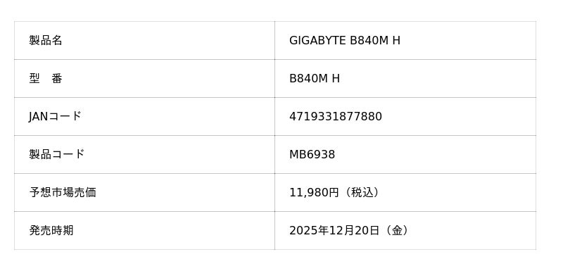 株式会社ニューエックス(本社:東京都千代田区)は、取り扱いメーカーであるGIGABYTEより、AMD B840チップセットを搭載した上新電機限定モデル Micro-ATX マザーボードの「GIGABYTE B840M H」を2025年12月20日(金)に発売いたします。