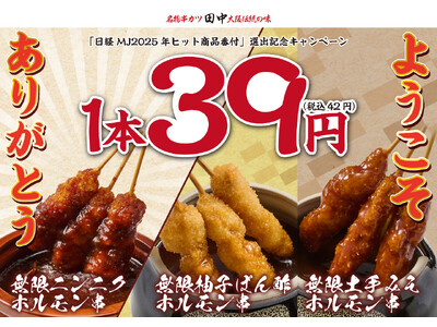 株式会社串カツ田中ホールディングス(本社:東京都品川区東五反田、代表取締役会長 兼 社長:貫 啓二)は、日経MJ「2025年ヒット商品番付」に「無限ニンニクホルモン串」が選出されたことを記念し、年末年始に「無限串1本39円(サンキュー)キャンペーン」を開催します。