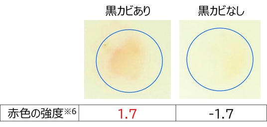 そこで、天井には目には見えないものの実は黒カビが生育しており、天井から床に黒カビが落ちて、床に生育するロドトルラに影響してピンク汚れを促進する可能性があると考え、天井の黒カビが床のピンク汚れに作用するかを検証しました。評価は、冬場の浴室を再現したモデル浴室で、黒カビ(クラドスポリウム)とロドトルラを共存させて行いました(※5)。その結果、黒カビを添加した板(図3「黒カビあり」)では、添加していない板(図3「黒カビなし」)よりも赤色が速く広範囲に広がり(※6)、黒カビがピンク汚れを促進することを確認しました(図3)。