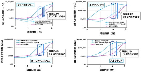 (※1) Cladosporium cladosporioides(以下、クラドスポリウム)、Exophiala alcalophila(以下、エクソフィアラ)、Aureobasidium pullulans(以下、オーレオバシジウム)、Alternaria alternata(以下、アルタナリア)
