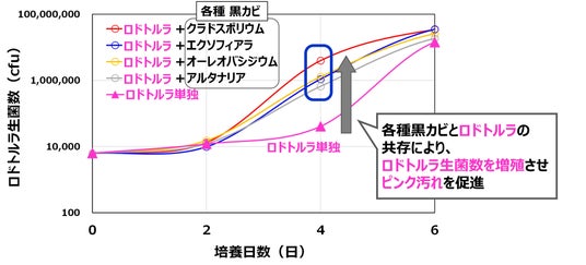 ピンク汚れの主な原因はロドトルラという菌で、この菌が増殖するとピンク色に見え、ピンク汚れとなります。浴室に生育する「複数種の黒カビ(※1)」とロドトルラを共存させ、冬場の浴室平均気温を想定して15℃(※2)で培養しました。その結果、すべての黒カビがロドトルラの生菌数の増加を促進することが明らかになりました(図1)。冬場においても浴室は黒カビが生育する温度・湿度を満たしているため、黒カビは「生きている状態」にあり(※3)、ロドトルラを増殖させピンク汚れを促進することがわかりました。