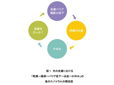 犬においても、図1のようなかゆみの負のスパイラルが形成されることが知られています。この悪循環は、皮膚の炎症の慢性化や再発の一因となるため、皮膚バリア機能を維持するスキンケアによる早期介入は皮膚の健康維持の一助となると考えられます。