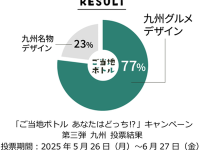 本キャンペーンは、2つのデザイン案からどちらかにご投票いただき、得票数が多かったデザインを特定の地域の『ご当地ボトル』として製品化する企画です。第三弾の九州のご当地デザインは、九州の自慢の食べ物をイラスト化した「グルメデザイン」と、様々な九州の名物をイラスト化した「名物デザイン」の2種類から投票いただき、77%もの得票率を獲得した「グルメデザイン」に決まりました。