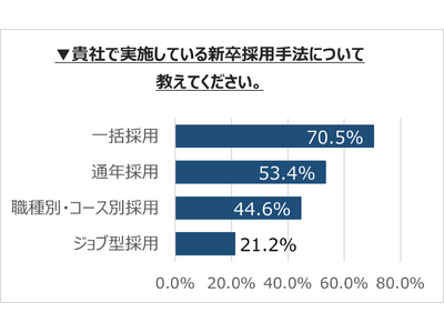 採用数の多い手法としては、「一括採用(53.3%)」が過半数半数を超えた。ただし、「通年採用(27.5%)」や「職種別・コース別採用(16.5%)」とする企業も多くなっている。