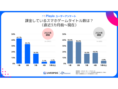 Playioユーザーアンケートより|課金しているゲームタイトル数(直近3カ月前~調査時点)2025年-2024年比較