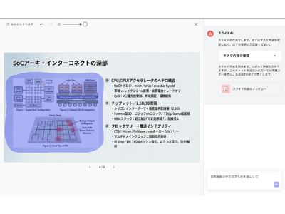 「自動編集機能」により、従来は人間がPowerPoint等で手作業で行っていた微調整作業を、AIによる部分再生成で置き換えることができます。これにより、最終仕上げにかかる工数を削減しつつ、スライド全体のトーンやデザインの一貫性を保ったまま、実用レベルの資料作成を支援します。