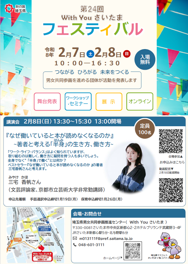 【埼玉県】男女共同参画を推進する37団体が活動を発表する第24回With Youさいたまフェスティバルを開催します-講演会の参加者募集-