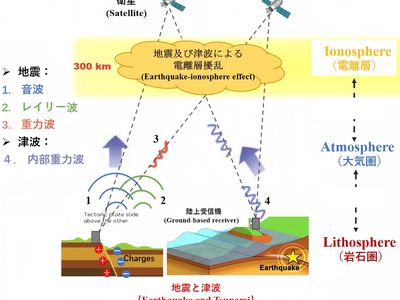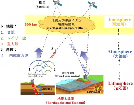 電離圏は地球大気中で高度約60 - 1000 kmの範囲に位置し、イオンと電子が存在する領域です。大規模な地震や津波が発生すると、急激な地殻変動やそれに伴う津波が大気を介して上空の電離圏に撹乱(Co-seismic Ionospheric Disturbances: CIDs)を引き起こします(図1)。これまで、電離圏撹乱の観測はGNSS受信機ネットワークにより観測されたTECデータを用いた