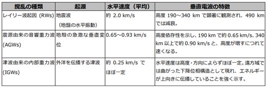 本研究により、地震に伴い発生する主要な3種の大気波動(1.レイリー波起因のCIDs、 2. 震源由来の音響重力波、3.津波由来の内部重力波)それぞれが、全く異なる垂直伝播特性を持つことを世界で初めて体系的に示しました。