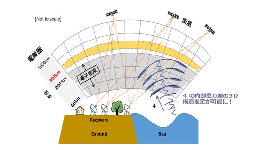 本研究では、高精度な3次元トモグラフィー技術(注3)を用いて、東日本大震災直後、震央付近から発生したレイリー波、音波、重力波、および津波に伴う内部重力波に関連した電子密度変動の3次元構造を精密に再構築しました