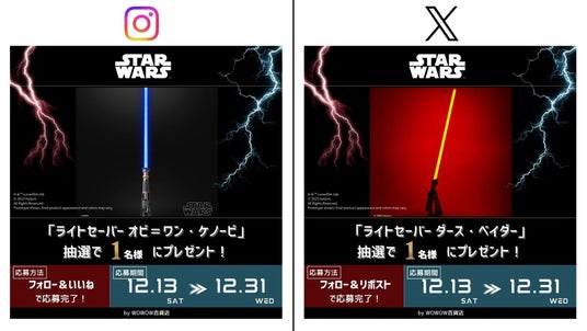WOWOW百貨店公式InstagramおよびXでは、スター・ウォーズファンに向けたプレゼントキャンペーンを実施しています。本キャンペーンでは、劇中に登場するライトセーバーを忠実に再現した本格仕様モデルを、Instagram・Xそれぞれ抽選で1名様にプレゼントします。
