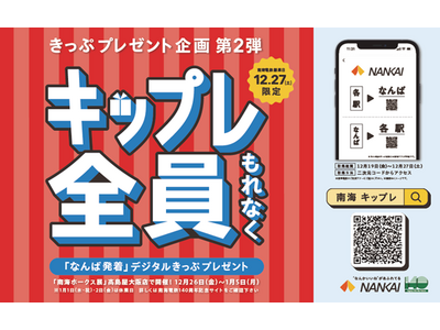 南海電気鉄道株式会社(社長:岡嶋 信行)では、創業140周年の感謝を込めて、創業記念日である12月27日(土)限定で、「南海アプリ」「なんばまるっとアプリ」などからお申込みいただいた方全員に、難波駅発着のデジタルきっぷを進呈する企画「キップレ」(第2弾)を実施します。本企画のデジタルきっぷは、運行状況や沿線おでかけ情報が取得できる「南海アプリ」や、なんばパークス・ なんばCITY・なんばスカイオ・なんばEKIKANの共通アプリ「なんばまるっとアプリ」などから遷移できる特設 ページからお申込みいただけます。スマートフォンをお持ちの方ならどなたでも取得可能です。