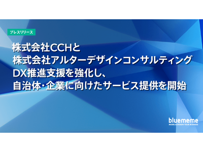 株式会社 CCH(本社:東京都板橋区、代表取締役社⾧ 高鍬 仁一、以下「CCH」)は、株式会社 BlueMeme(本社:東京都千代田区、代表取締役社⾧ 宮脇 訓晴)の子会社であり、AIを活用したコンサルティング事業を展開する株式会社アルターデザインコンサルティング(本社:東京都港区、代表取締役社⾧ 森田 孝一、以下「ADC」)と、AIを活用した次世代型DX推進に関する業務提携に向けた基本合意書(以下「本基本合意」)を締結いたしましたので、お知らせいたします。