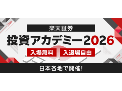 楽天証券株式会社(本社:東京都港区、代表取締役社長:楠 雄治、以下「楽天証券」)は、2026年に、全国8都市で「投資アカデミー2026」を開催することをお知らせします。本セミナーは、楽天証券のお客様が無料で参加可能な各会場での開催に加え、当日会場にお越しいただけないお客様なども参加できるよう、ライフスタイルにあわせた視聴が可能なオンライン配信もおこなう、ハイブリットセミナーの形式で開催します。