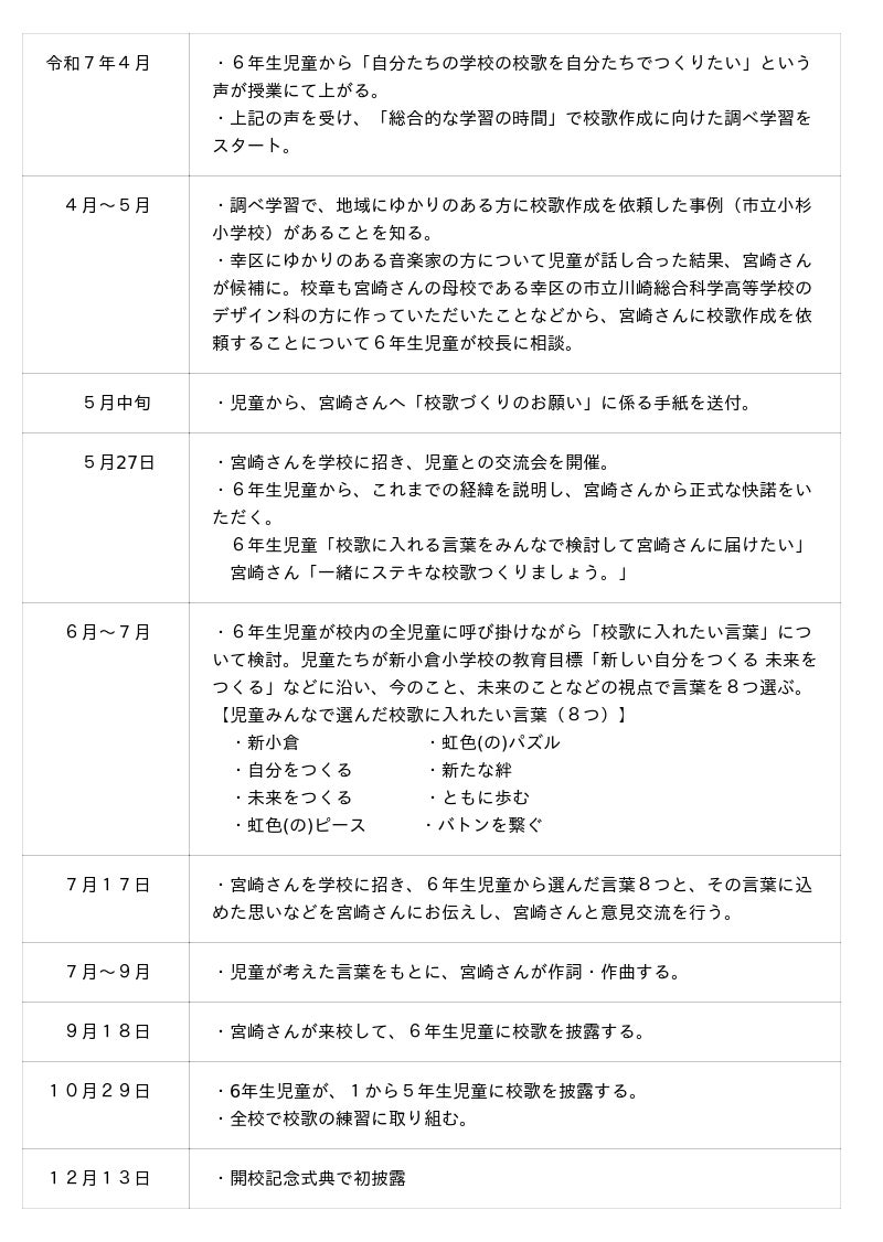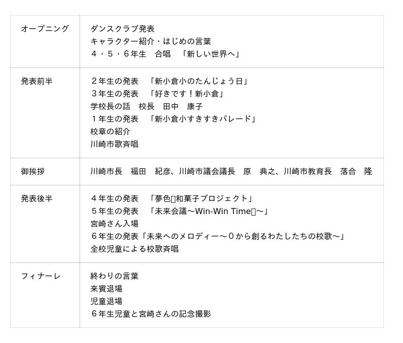 新小倉小学校では、児童の発案により、川崎市出身の3ピースロックバンド「SHISHAMO」のGt.Vo 宮崎朝子(みやざき あさこ)さんとともに校歌を制作する取り組みが進められてきました。児童が考えた「校歌に入れたい言葉」をもとに、宮崎さんが作詞・作曲を担当し、児童による練習を経て、式典当日において、出席した512名の児童たちにより校歌が初披露されました。