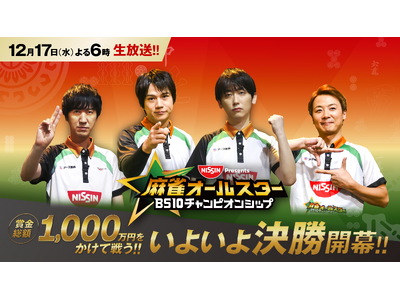 全国無料のBS放送局「BS10(ビーエステン)」にて、毎週水曜日に生放送でお届けしている『日清食品Presents 麻雀オールスター BS10チャンピオンシップ』。12月17日(水)よる6:00からは1年を通して勝ち上がった4名による最後の戦いが行われます。