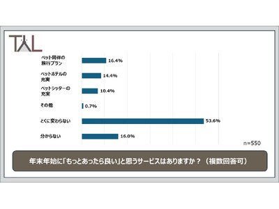 さらに「ペットを預ける際の決め手となる要因はなんですか?」と質問したところ、最多は「信頼できるサービス/人物であること(62.0%)」。次いで「料金(47.4%)」が続き、費用を抑えつつも安心できる預け先を求める飼い主心理が浮き彫りになりました。また、飼い主550名に「年末年始に『もっとあったらいい』と思うサービスはありますか?」と質問したところ、半数以上が「とくに変わらない」と回答した一方で、「ペット同伴の旅行プラン(16.4%)」「ペットホテルの充実(14.9%)」「ペットシッターの充実(10.4%)」など、外出時に利用するサービスへの期待が一定数寄せられたほか、「ペットと一緒に入れるレストランの充実(男性・60代前半)」といった具体的な要望も見られました。
