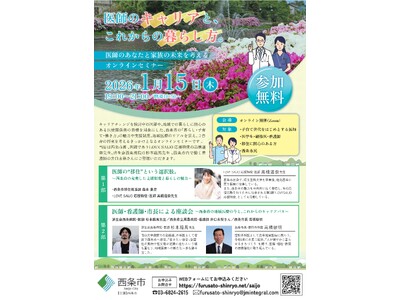 この度、西条市の「暮らし・子育て・働き方」の魅力や支援制度、地域医療のリアルを伝え、自身の将来を考えるきっかけとなる第2回目のオンラインセミナー(WEB勉強会)を開催することとなりましたのでお知らせします。