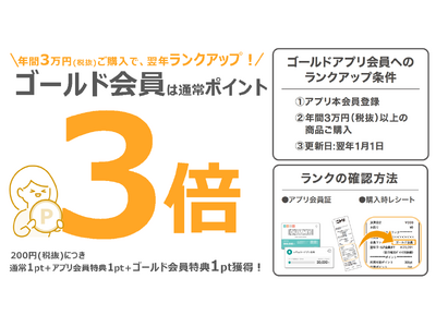 ●ランク判定期間(1月1日から12月31日までの1年間)の購入金額が30,000円(税抜)以上で翌年1月1日にゴールドアプリ会員にランクアップします。
